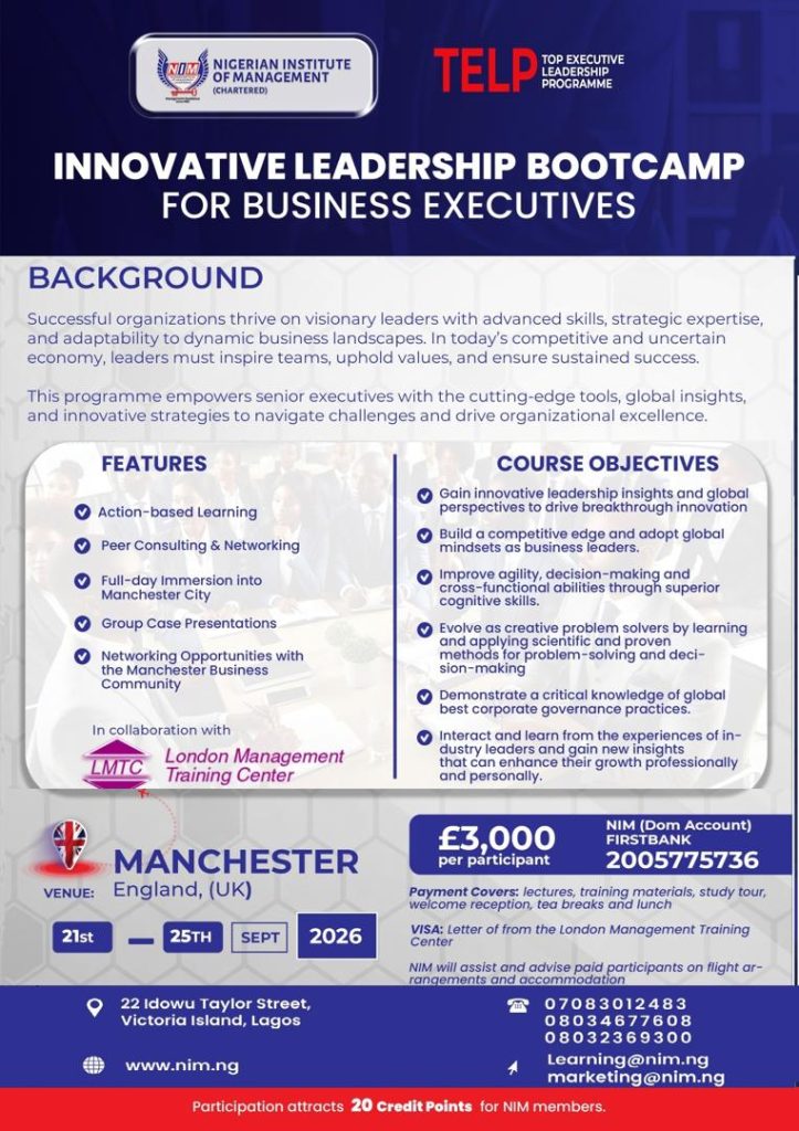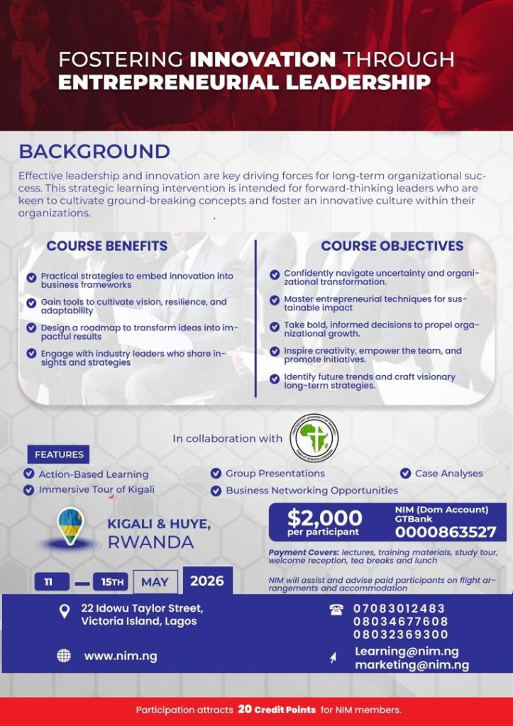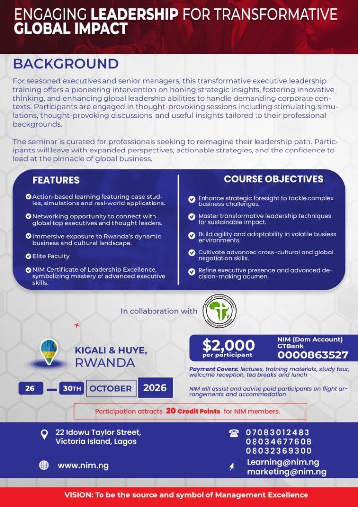 NIMโs new Management, Leadership, and Governance Courses (MLGC). These robust programmes are designed to equip leaders at all levels, including board directors, with the skills and competencies needed to thrive in today’s fast-paced business environment. With MLGC, you will gain the needed strategic leadership insights and expertise to navigate uncertainty, seize opportunities, and drive growth.